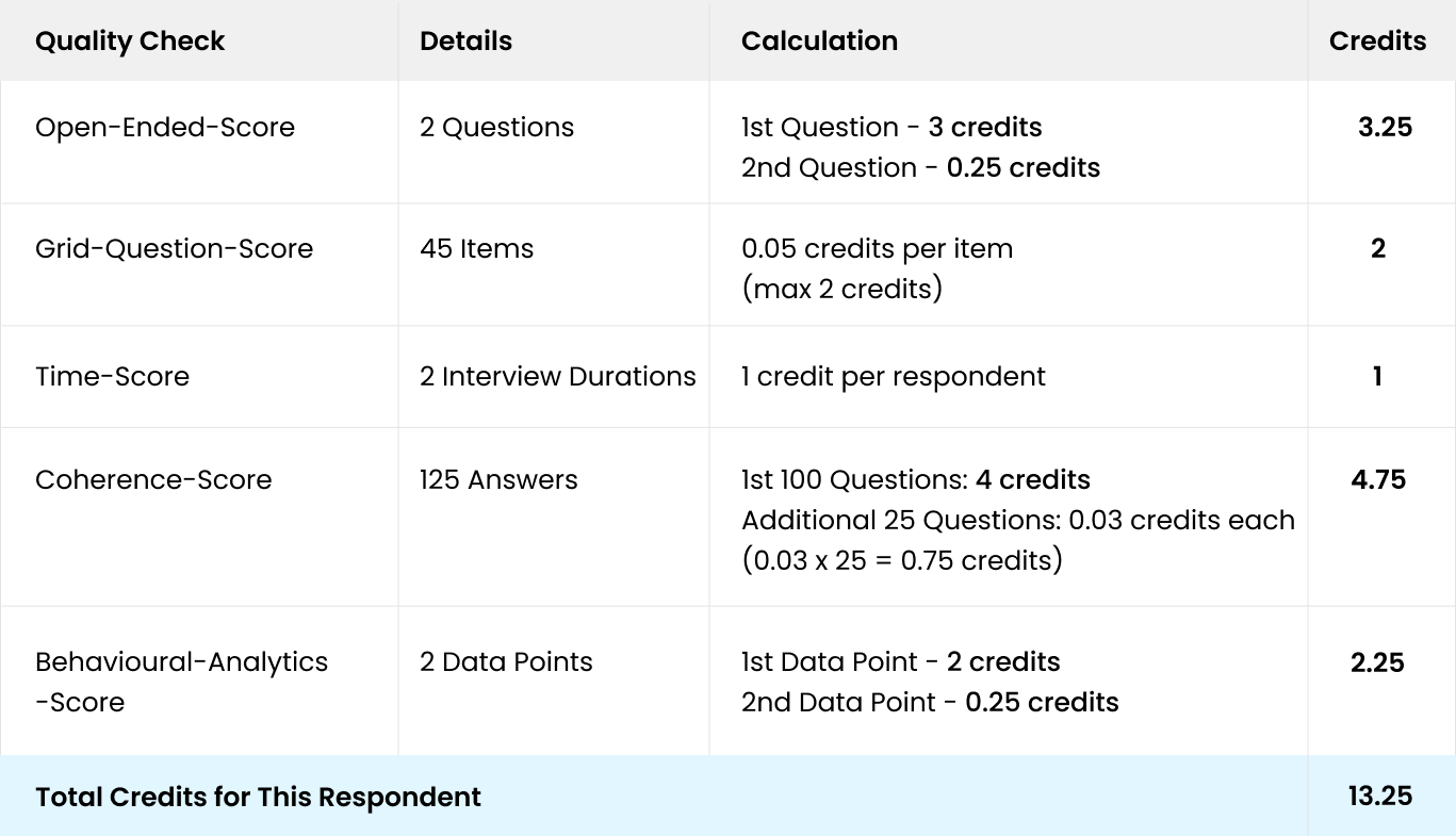 The following list provides a clear overview of how credits are calculated based on Quality Scores, with all calculations applied on a per-respondent basis:| Score Type | Base Credits | Additional Credits | Maximum Credits |