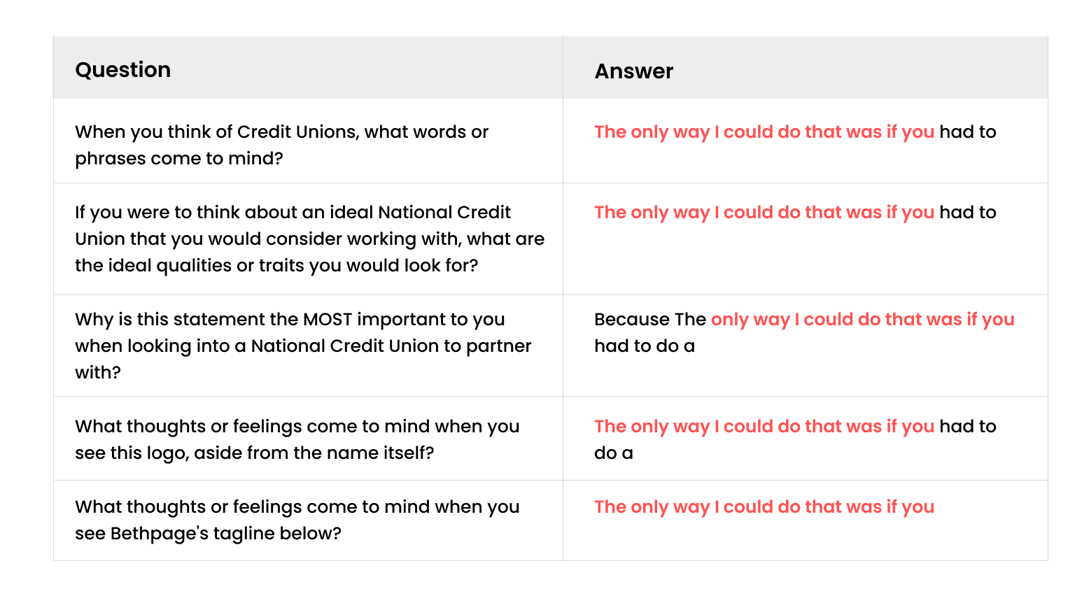 We verify if a respondent’s answers are repeated or partially repeated across multiple questions. These responses are classified as “Duplicate Answer” and scored 50 for a single duplicate or 0 for multiple duplicates.