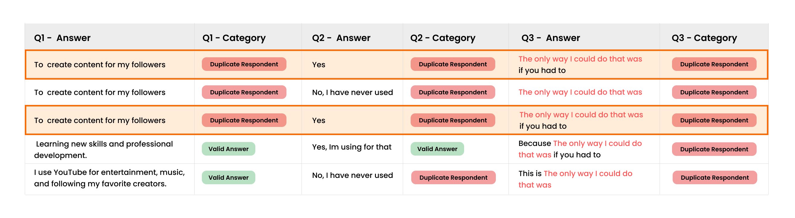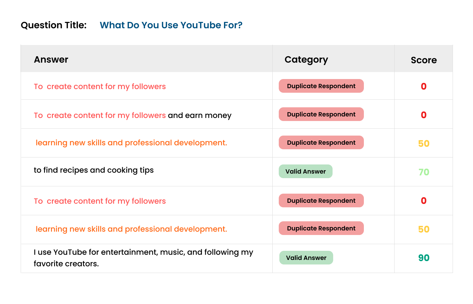 - Duplicate Respondents Across Multiple Questions: Our duplicate check also detects responses repeated across multiple questions. Such responses are classified as “Duplicate Respondent” and assigned a score of 10.