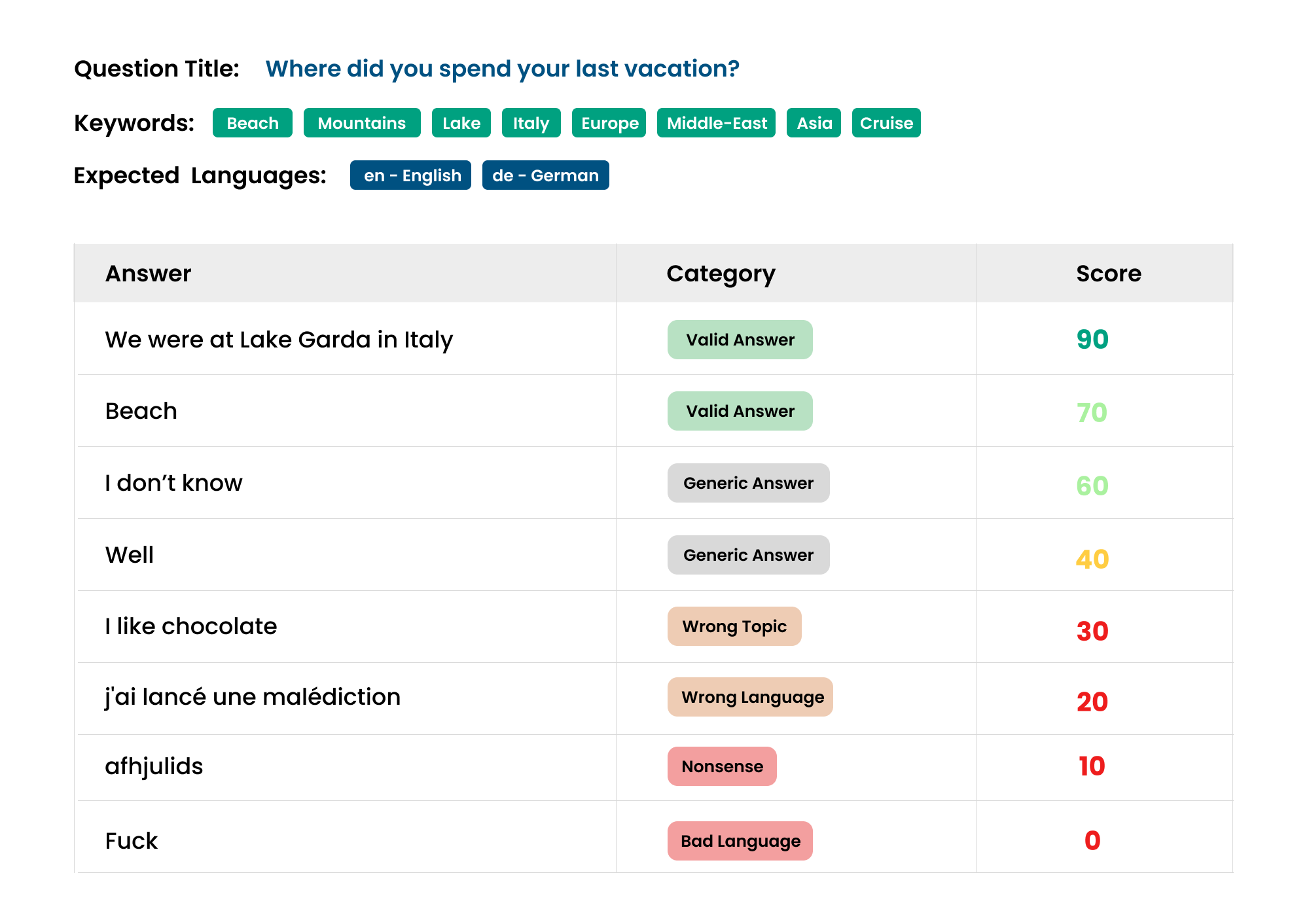 Responses in an unexpected language are categorized as “Wrong Language” and assigned a score of 20. You can define the expected languages; without this, the language check remains inactive. Open-Ended Score supports over 100 languages, including English, German, French, Spanish, Chinese, Japanese, Swedish, and more.